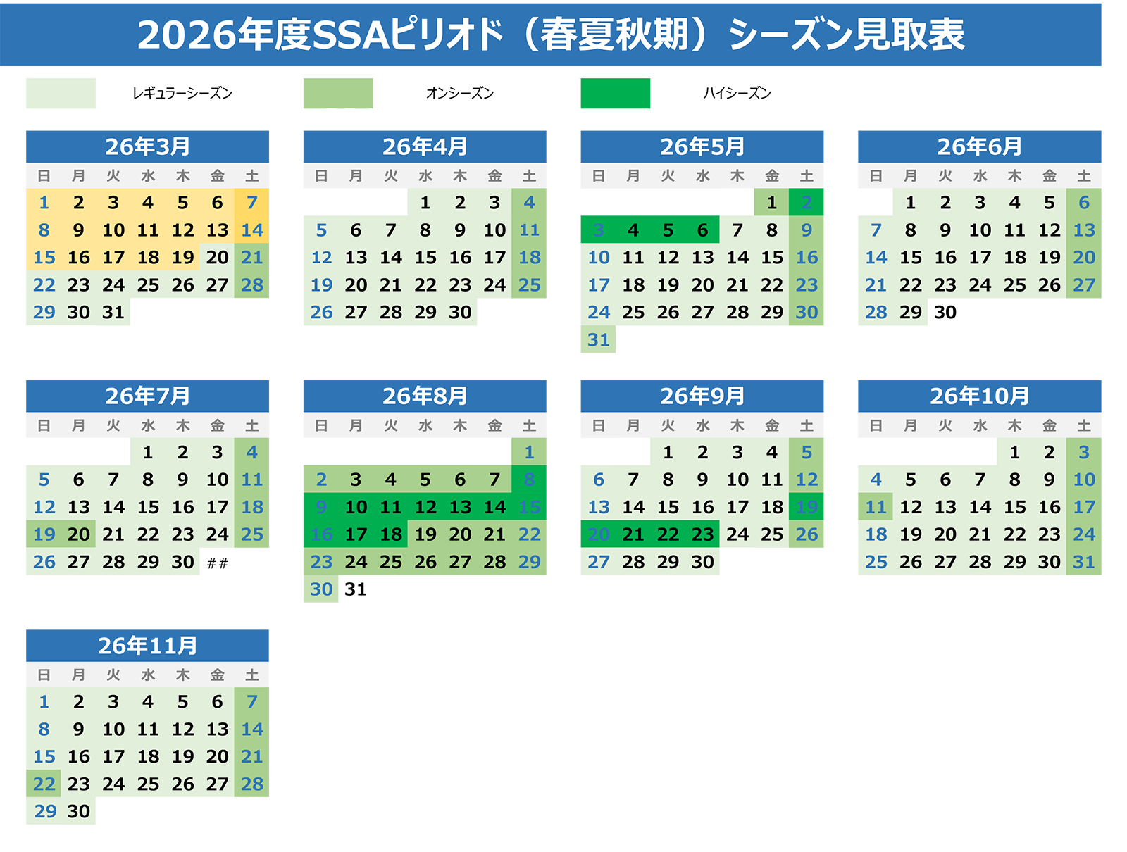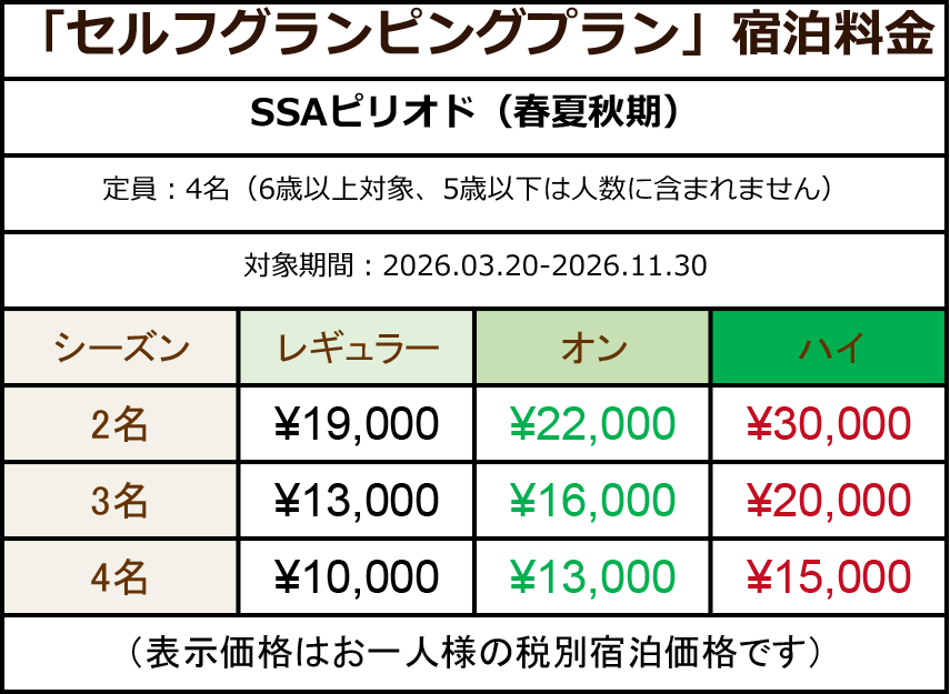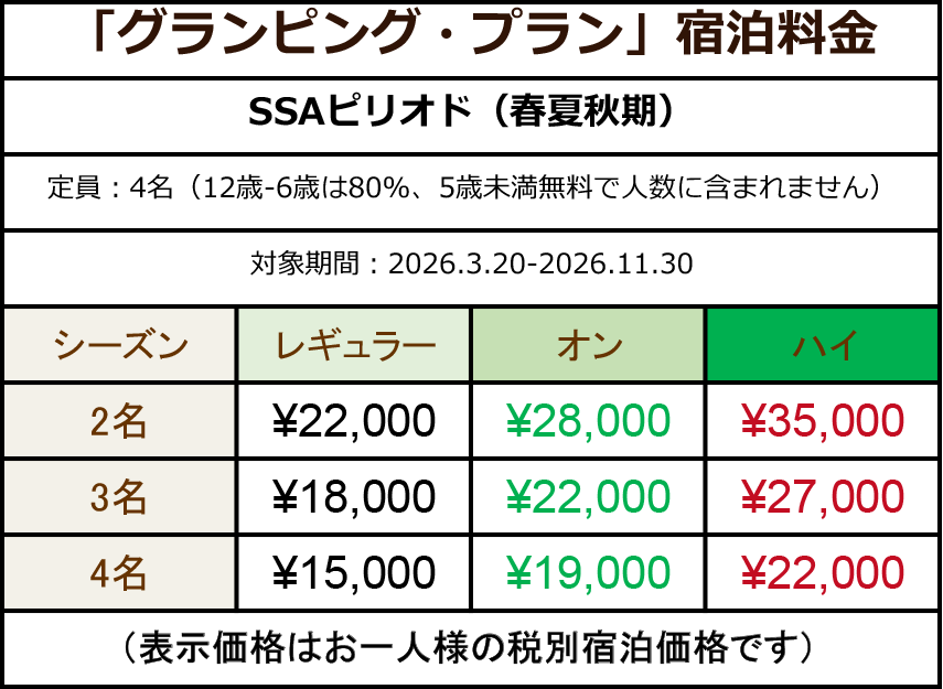 We use a dynamic pricing system (variable pricing system) depending on the season (period) and season (date): SSA period (spring/summer/fall) is from March 20 to November 30, and W period (winter) is from December 1 to March 19. Please note that the price per room will also vary depending on the number of guests per building.